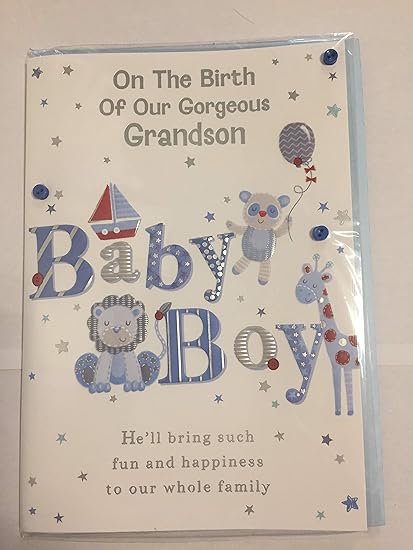 On The Birth Of Our Gorgeous Grandson Baby Boy New Baby Card From Grandparents White Blue Red Silver Words Stars Buttons Foil Detail Amazon Co Uk Office Products