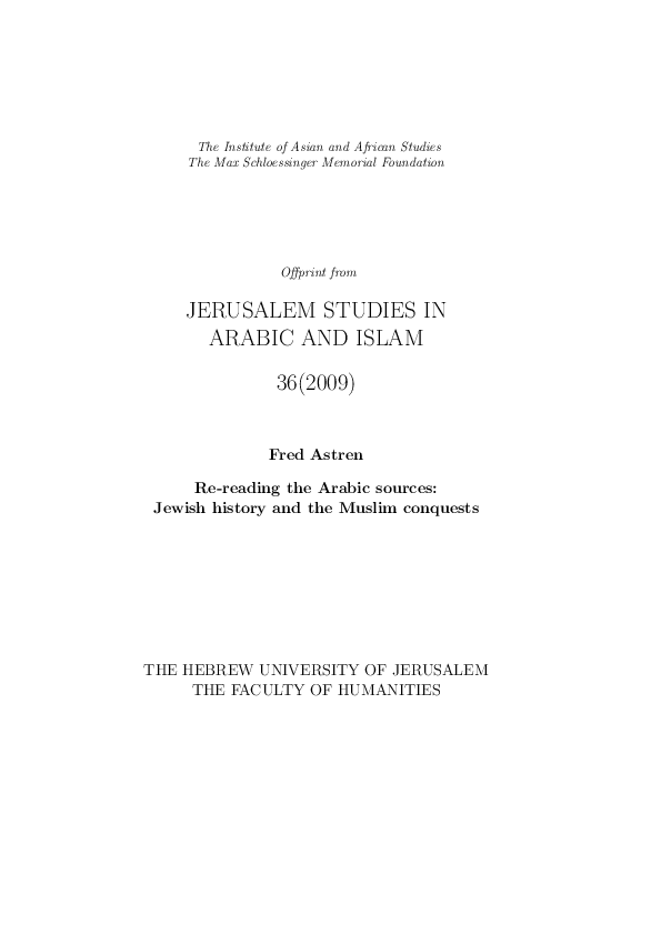Pdf Astren Re Reading The Muslim Sources Jewish History And The Muslim Conquests In Yohanan Friedmann Ed Jerusalem Studies In Arabic And Islam 35 2009 83 130 Fred Astren Academia Edu